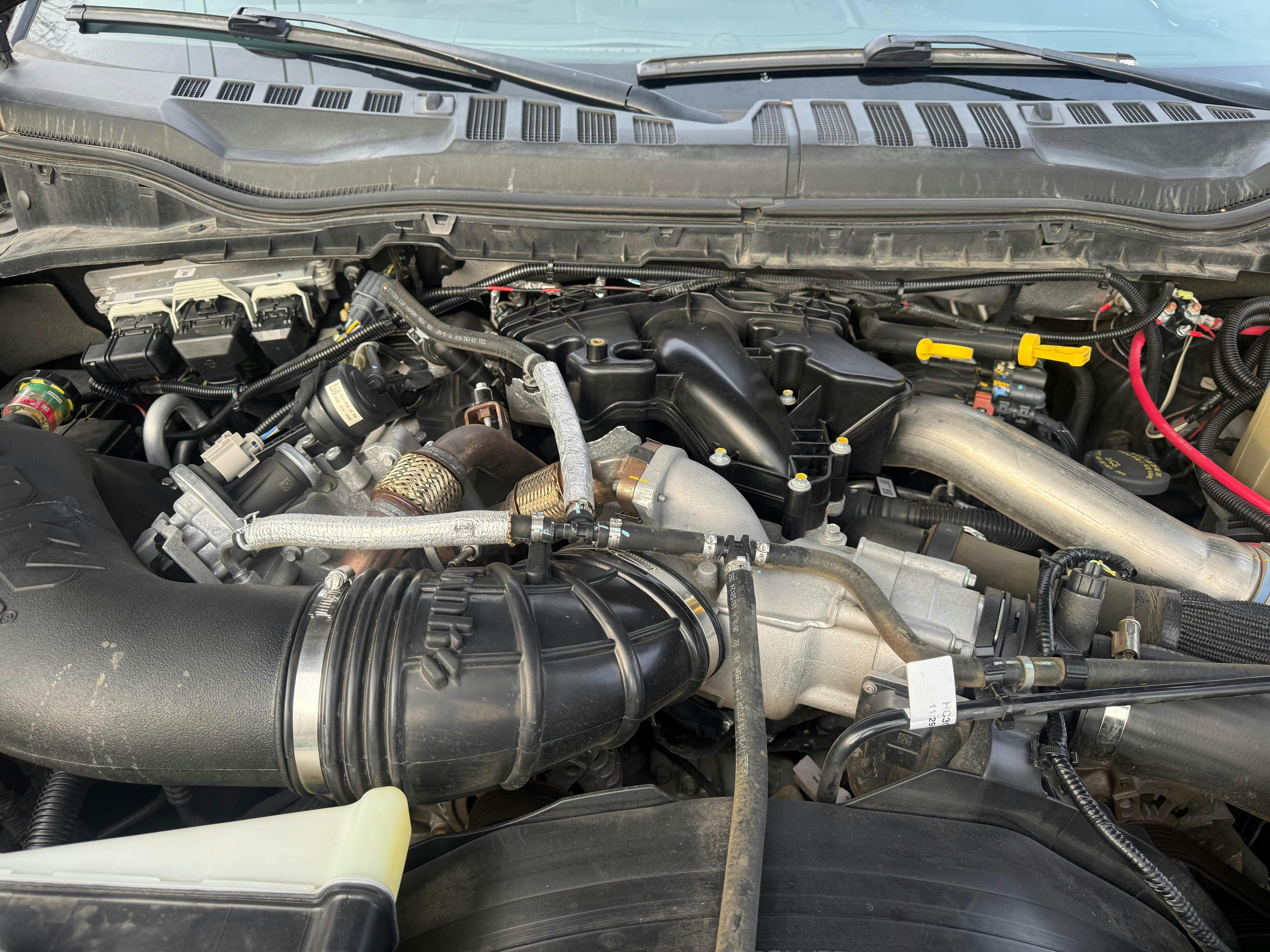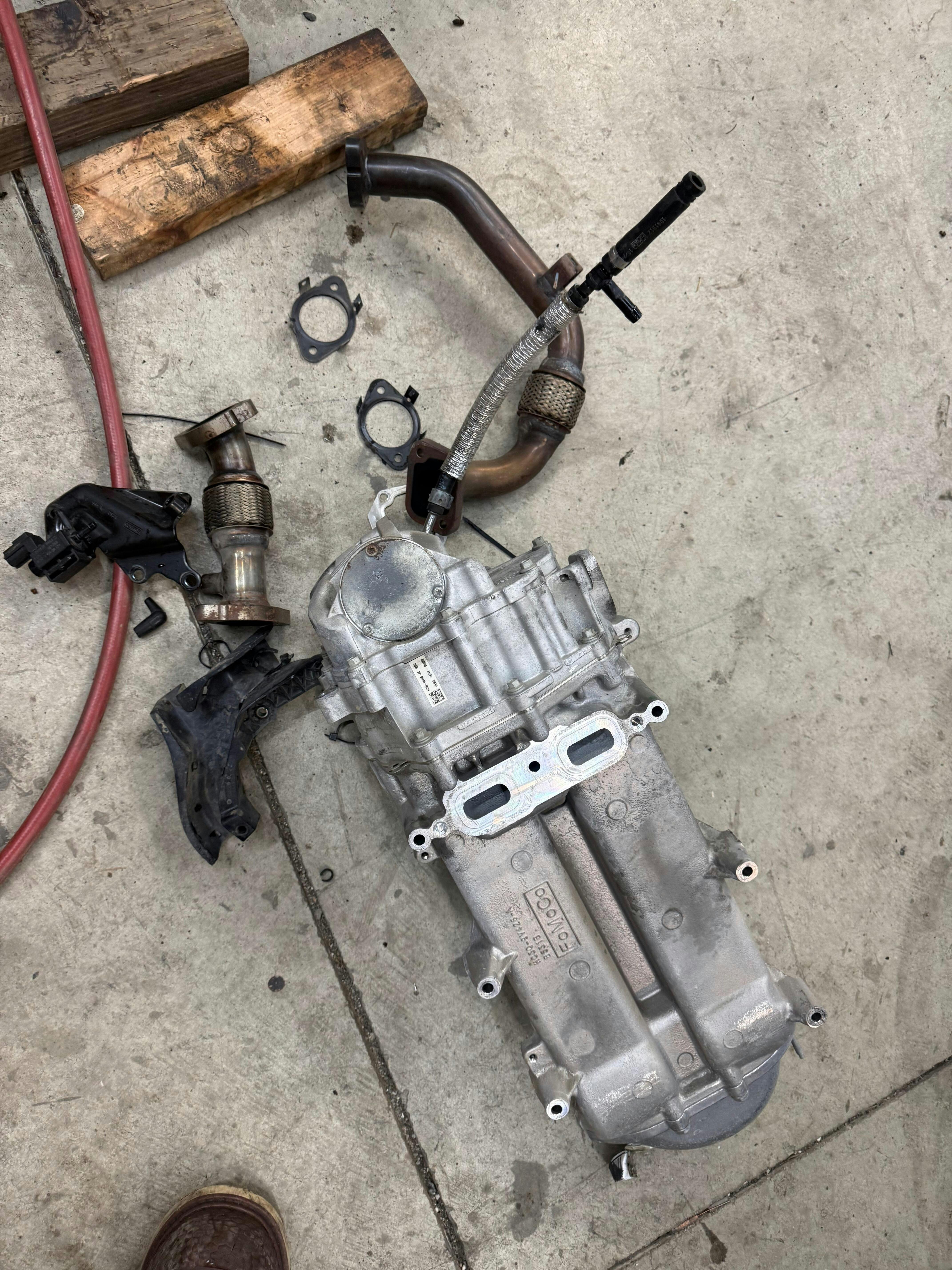 1.Use the newly provided coolant hose and hose adapter to connect the two coolant ports previously connected to the EGR cooler. Secure the hose with the provided hose clamp.